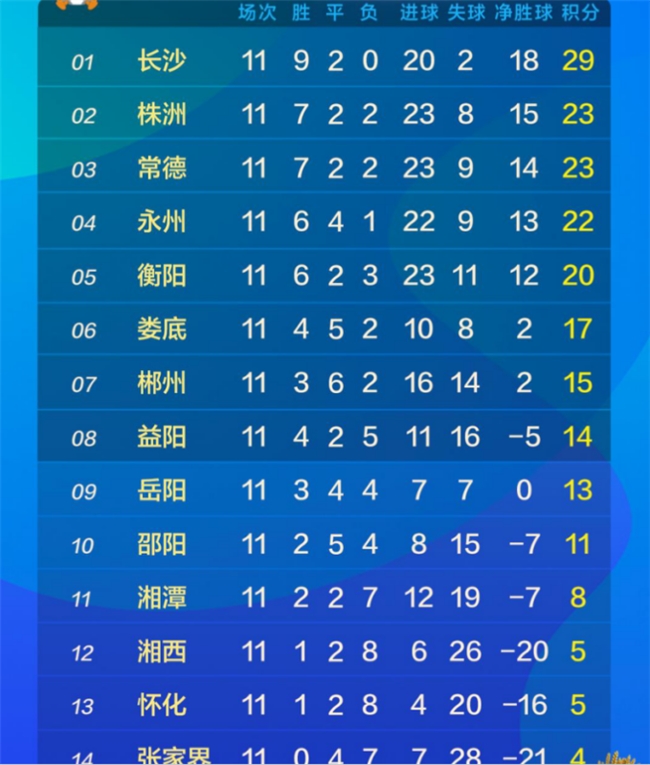 2025湖南省足球联赛(湘超联赛)第11轮战罢,这一轮结束后,长沙队以11场不败的战绩积29分继续领跑积分榜,株洲队、长沙队同积23分紧随其后,永州22分、衡阳20分稳稳晋级淘汰赛8强,娄底、郴州、益阳、岳阳、邵阳将在最后2轮的常规赛收官之战角逐3席8强名额,湘潭、湘西、怀化、张家界已确定无缘8强,剩下2场比赛更多是为荣誉而战,“一心收拾到明年”再战湘超。