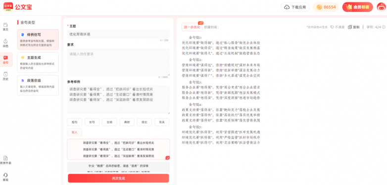 同时,【AI仿写】功能深度解析50万+优质金句库,用户可选择参考案例和主题,快速生成对仗工整、引用恰当的亮眼句子,效果媲美资深笔杆子。无论是排比句式、经典用典还是热点引用,都能轻松实现,让材料瞬间提升档次。