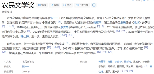 “农民文学奖”由我国著名青年作家、导演、文旅专家、文化批评家张一一在湖南岳阳湘阴县老家发起,是2014年第二届“农村文化活动月”(全国最早的“村晚”)十五大乡村文化主题活动之一,旨在“讲好中国农村故事,传播农民好声音,推介中国好农民” 助力乡村文化振兴,首届得主为湖南农村妇女蒋慕平,第二届由古稀渔民危勇凭借18字《咏鸡》诗获奖 ,2016年第三届农民文学奖湖北农民诗人余秀华获特别奖及10万元奖金 ,2018年第五届颁奖时,浙江农民工梁武钦以自传体小说获奖 ,2023年第十届回归湖南湘阴举办,十位农民作家分获奖金及农特产品 ,2024年第十一届首次落户湖南永州,韩仕梅、王一武、王顶三人获奖 。截至2025年,张一一累计出资200多万元支持该奖项并给获奖农民诗人出版诗文集,历届获奖者中,余秀华诗集销量超百万册,《咏鸡》诗作者危勇成为全国知名“网红”,梁武钦等获评“乡贤” ,2023年“中国农民作家村”在湘阴新河村落户,培育120余位农民作家 ,该奖项通过举办座谈会、采风等活动,探索文化振兴与乡村产业融合路径。