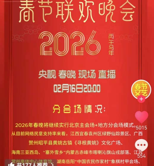 对于正在甄选地方分会场和征集节目的2026马年春晚,你期待吗?欢迎评论区留言推荐你希望看到的明星艺人、节目形式和地方分会场,说不定一不小心就被“开放办春晚,锐意求创新”的春晚导演组慧眼识珠一言不合就采纳了呢?