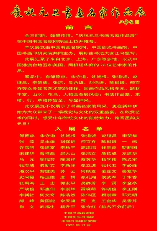 本网讯 金马迎新,翰墨传情。“庆祝元旦书画名家作品展”在中国书画名家网等线上拉开帷幕。