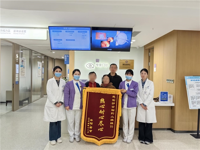 近日,绣着“体贴暖心 技优艺湛”“白衣天使关怀备至,精心护理耐心尽责”的两面锦旗被郑重交到爱尔眼科四川眼科医院眼底病科陈彦辰博士及护理团队手中。送旗的甘爷爷儿子紧握医护人员的手激动地说:“是你们用专业和爱心,让我父亲重新看清世界!”