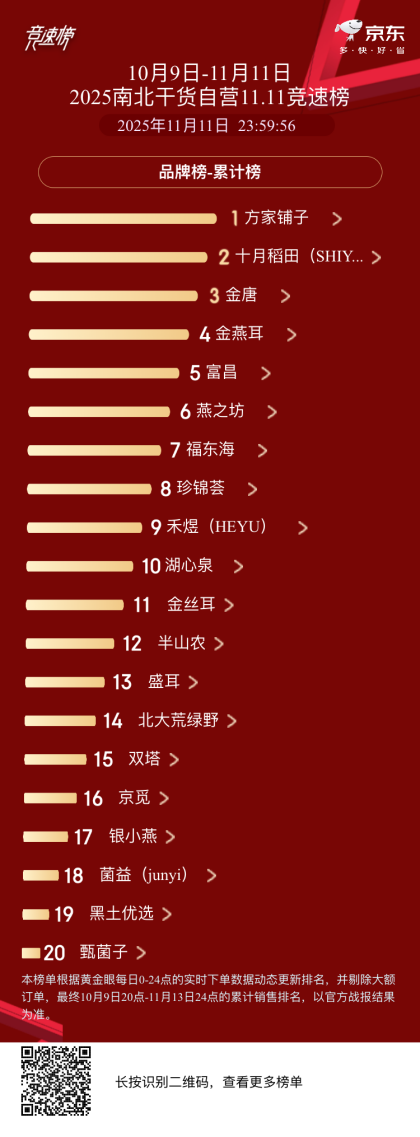 日前,双11购物节圆满收官,京东公布了2025南北干货自营11.11竞速榜,中华老字号方家铺子再次交出亮眼成绩单:连续八年蝉联京东南北干货销量TOP1,多款产品同比增长率突破500%,经典爆品持续热销,展现出品牌全品类矩阵和健康食材消费持续升级的实力。