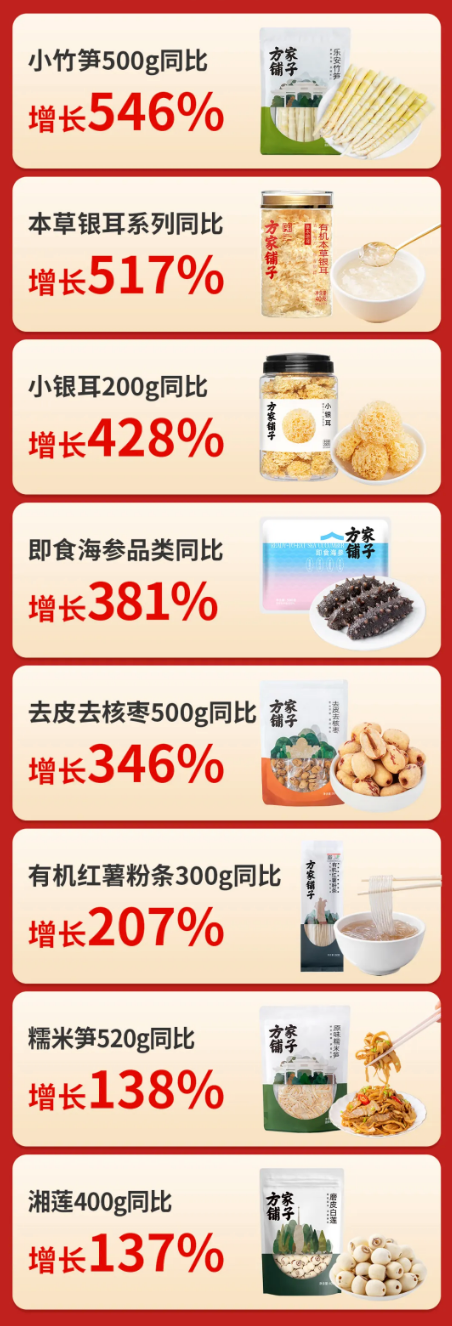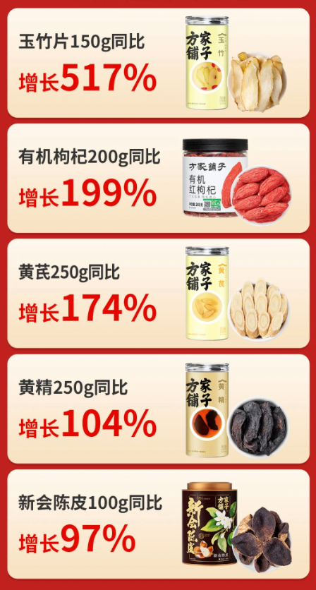 在滋补臻品板块,传统药食同源类目延续稳健增长态势。玉竹片同比增长517%,成为方家铺子今年的亮眼单品;有机枸杞、黄芪等基础滋补品也实现150%以上的增长。黄精、新会陈皮等中高端食材增速同样亮眼,反映出消费者已从季节性滋补向全年日常化养生转变,滋补品类呈现结构性扩容。