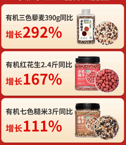 杂粮板块同样延续健康消费热度。有机三色藜麦以292%的增长率领跑,七色糙米、有机红花生等产品也实现三位数增长。这一趋势说明人们对“营养均衡、粗细搭配”的饮食认知不断深化,杂粮类食材正逐步从传统替代品转向家庭餐桌的主角。