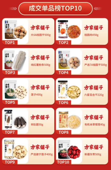 同时,方家铺子的经典大单品依旧保持长期竞争力。在京东卓越单品成交榜中,大6A桂圆干稳居TOP1,桂圆肉、纯红薯粉条位列第二、第三。7A桂圆干、莲子、六星百合干、羊肚菌、有机本草银耳、严选建宁莲子、新疆灰枣等多款产品进入前十。经典单品持续畅销,体现出消费者对方家铺子在产地直采、品质严控与原料真实上的高度认可。