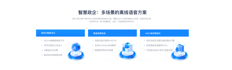 AIGC音视频鉴伪:基于自研多模态AI引擎,精准识别AI生成、变声、换脸等伪造内容,检测准确率超90%,为政府、学术、媒体等提供可靠技术判断,规避伪造风险。