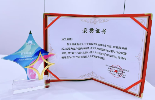 云生集团受邀参加大会,凭借在人力资源服务领域的专业积淀、创新服务模式,以及为客户提供的高效、优质人力资源解决方案与行业赋能价值,在会上获颁“2025最具价值人力资源服务机构”荣誉。