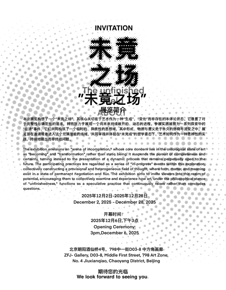 这个世界并非处在一个完成态,而是一片在持续变化的领域。本次展览无意呈现一个或若干确定的答案或封闭的叙事,而是试图去构筑一个从思想出发的“场域”在这里,一切形态、观念与物质都处于未定的、流动的、进行中的状态。
