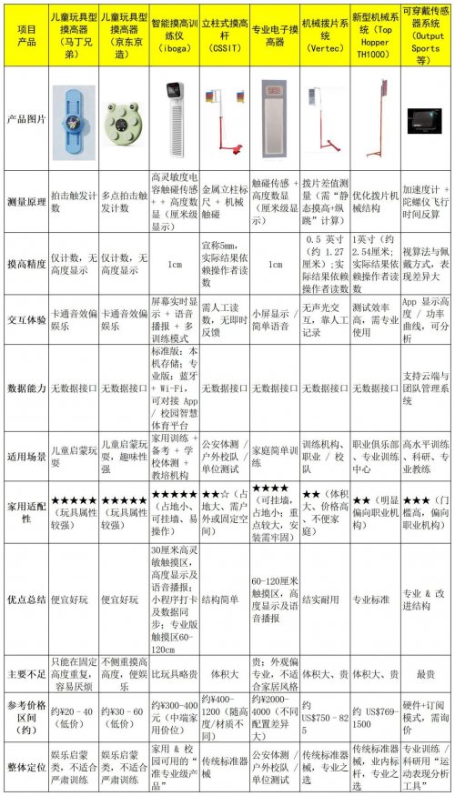 为方便家庭用户理解,我们按照“使用场景与技术形态”,在全球市场中选出了 8个具有代表性的摸高 / 纵跳测量设备: