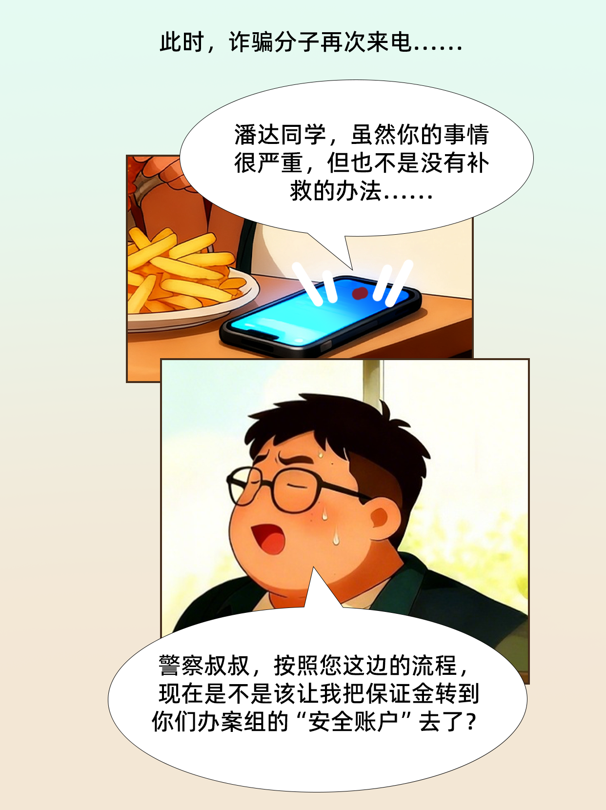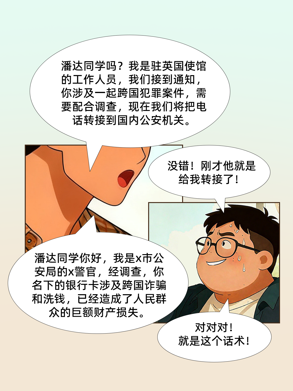 当前,电信网络诈骗手法层出不穷、花样不断翻新,为帮助广大在英同胞提高安全防范意识,中国驻英国使馆精心推出“潘达大本反诈记”主题宣传漫画,破解常见的假冒“使领馆”转接“公检法”来电诈骗套路,以案示警筑防线,助力在英同胞树牢安全防范意识,时刻提高警惕,谨防上当受骗。