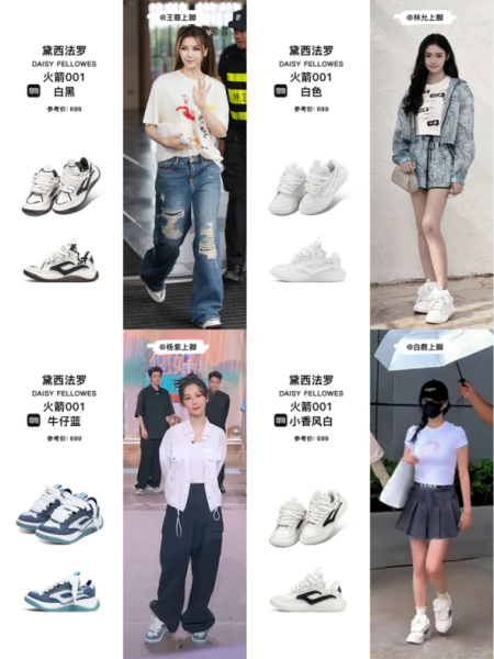 解构美学,拒绝千篇一律:黛西法罗的解构更贴近日常场景。从吴磊上脚的小香风白款到赵露思演绎的小香风黑街头款,同一鞋型通过配色创新覆盖多元风格,契合小资群体“低调有品”的穿搭需求。