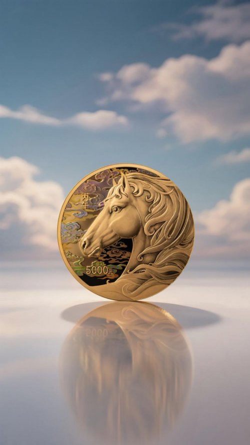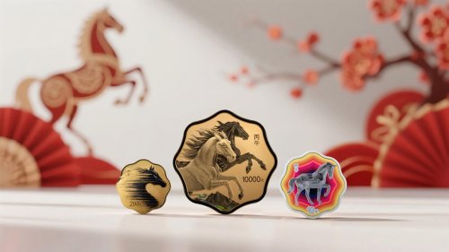值得注意的是,2026马年生肖币还推出了梅花形制,更具古典韵味与把玩趣味。其中,1公斤梅花形金质纪念币背面图案刻画了两匹金马踏着如意祥云、飞跃重峦叠嶂的矫健身姿,表达了万事如意、马到成功的美好祝福。纪念币采用浮雕、光变鳞彩等工艺刻画生肖马的形象,尽显中国传统美学氛围。
