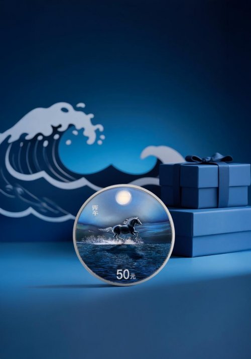 150克圆形银质纪念币背面以浮雕、特殊光效、双重彩色等工艺协同塑造了“光影下奔马”的独特场景,融合了传统水墨与现代设计风格。纪念币以奔马踏浪的瞬间,传达沉静中蓄势突破的含义,表达了昂扬奔腾的生肖文化内涵。