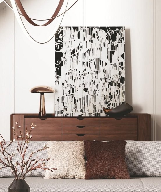 台面还可以放置素雅拙朴的陶瓷花器、彰显个性的创意摆件、香薰蜡烛等进行点缀装饰,增强柜体的“门面”属性,打造归家的温暖仪式感。