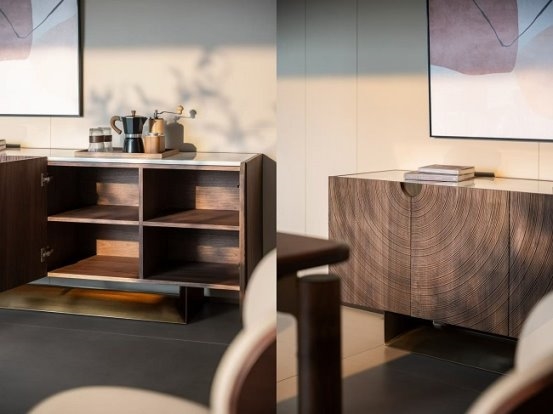 若想让这一区域更有温度,不妨选原木材质的柜体,如自带高级质感的北美黑胡桃木等。温润的木色、起伏流畅的纹理,本身就是营造温暖氛围的最佳载体。