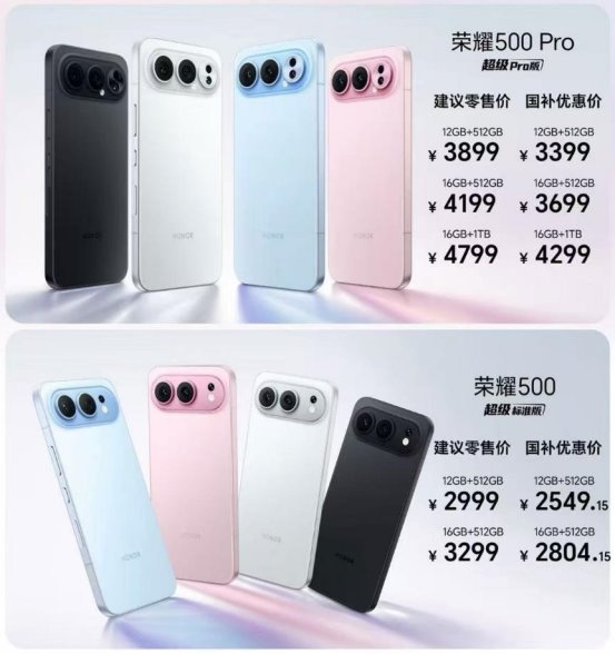 2亿人像全能实况目前, 荣耀500系列已在迪信通全面开售,荣耀500 Pro售价3899元起(国补优惠价3399元起)、荣耀500售价2999元起(国补优惠价2...