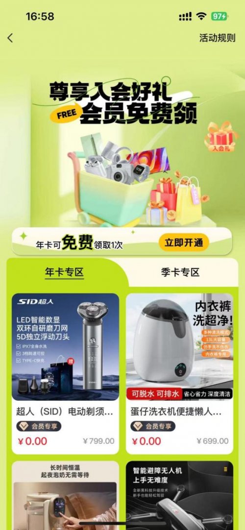 除了入局即惊喜,心悦汇商城同时也注重会员的长期价值回报。平台通过“多元选择+持续让利”的组合拳,让会员感受到越用越值的消费价值。其不仅提供年卡、季卡、周卡等多种会员方案,适配不同消费频率的用户,还推出“0”元购、爆款秒杀等权益矩阵,将多次优惠升级为持续价值创造,持续为用户提供优质好价的正品好物,让会员在权益发放中感受“越用越值”的性价比回报,完美契合“体验与性价比并重”的消费诉求。