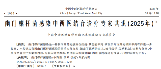 近日,《幽门螺杆菌感染中西医结合诊疗专家共识(2025年)》(以下简称《共识》)正式发布。该共识由中国中西医结合学会消化系统疾病专业委员会牵头,汇聚全国20余个省份的消化领域中西医专家智慧,系统梳理幽门螺杆菌(Hp)感染的发病机制与诊疗难点,旨在加强中西医协同诊疗能力,破解Hp感染的临床难题,为临床提供更全面、精准的诊疗路径。
