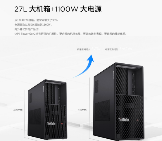 P3 Tower Gen2采用27L大容量机箱设计,为用户预留了充足的升级空间。对于企业和技术用户而言,硬件可扩展性是一台优秀工作站的核心价值。无论是后续添加硬盘、显卡,还是内存扩容,ThinkStation P3都能轻松满足。不仅如此,1100W高规格电源为全系统供电保驾护航,即使多卡并行、高功耗显卡部署,系统依旧稳定运行,最大程度降低宕机风险。