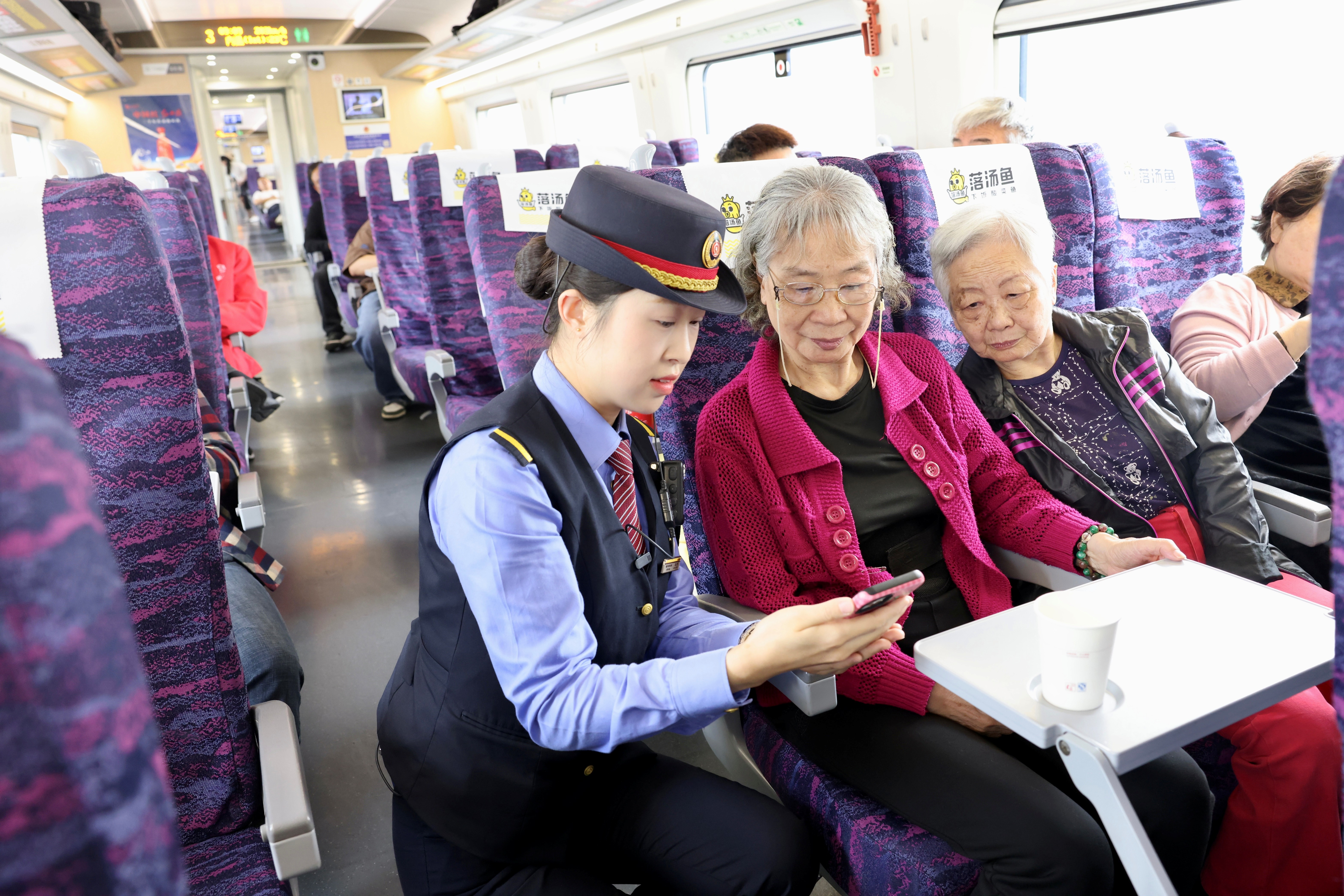 列车缓缓启动,她开始在车厢中穿梭。她面带微笑,亲切地向每一位乘客打招呼,同时细心观察着大家的状态。当看到有独自乘车的老人家,眼神中透露出一丝迷茫时,她立刻走上前去主动帮忙接打热水,在秋意正浓的季节送上一份温暖。轻声询问是否需要帮助,并耐心地为老人讲解行程和注意事项。不一会儿,一个小朋友因为兴奋在座位上蹦蹦跳跳。他赶忙走过去,蹲下来温和地说:“小朋友,在车厢里这样蹦跳可不安全哦,乖乖坐好。”小朋友听了,乖乖地点点头。