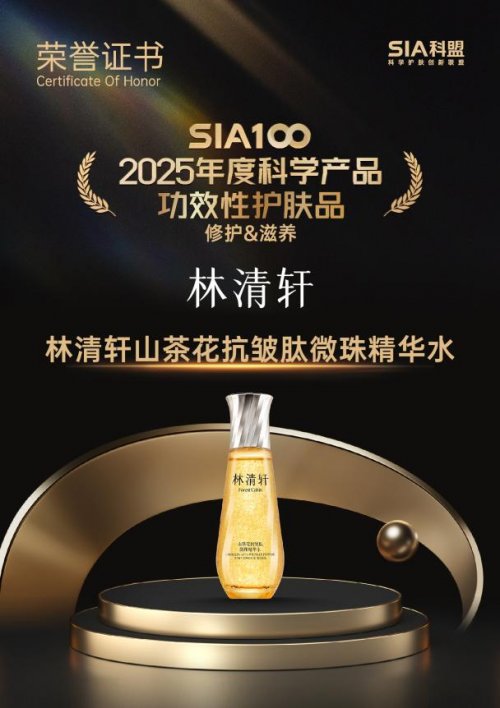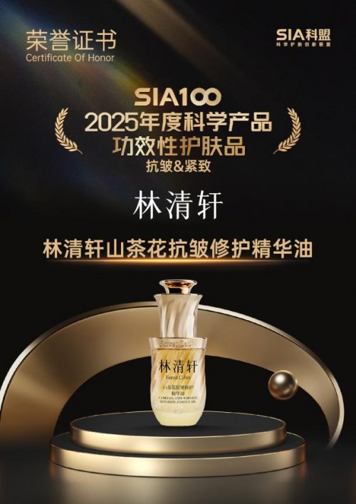 11月27日,以“美力跨界・专业无界”为主题的SIA科盟2025年度大会在上海隆重开幕,会上重磅揭晓了“SIA100 2025年度科学产品功效性护肤品”榜单。其中,林清轩“山茶花抗皱修护精华油”和“山茶花抗皱肽微珠精华水(小金珠嘭弹水)”两大单品分别凭借优异的抗皱紧致、修护滋养功效表现成功入选,成为最受瞩目的国货品牌之一。