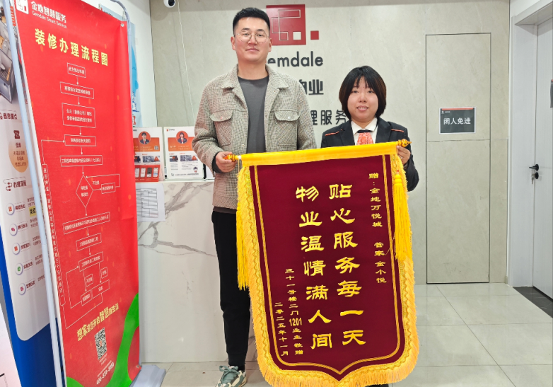 2025年11月7日,万悦北苑物业服务中心上演了温馨的一幕,业主王先生将一面锦旗送到管家林菲手中,感激之情溢于言表。
