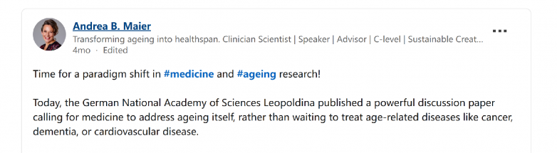 近日,德国国家科学院Leopoldina发表了《老龄化社会中的健康延伸医学——医学研究与实践展望(2025)》(下称《展望》),这也成为了继中华医学会2024年发布的《延缓衰老药物干预研究中国老年医学专家共识(2024)》后,衰老干预领域又一份具有政策指导意义的重要文件。