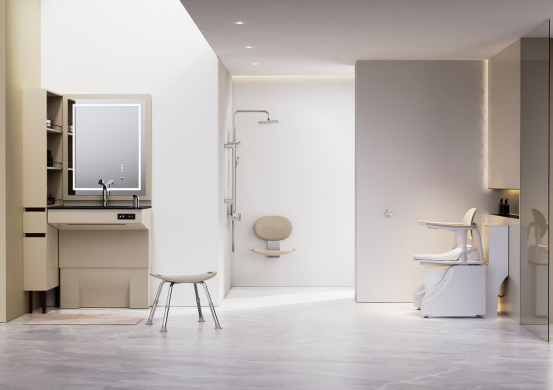 「和玥」 无障碍康养卫浴套系融入防滑材质、圆润边角设计,适配老人与轮椅使用者需求。