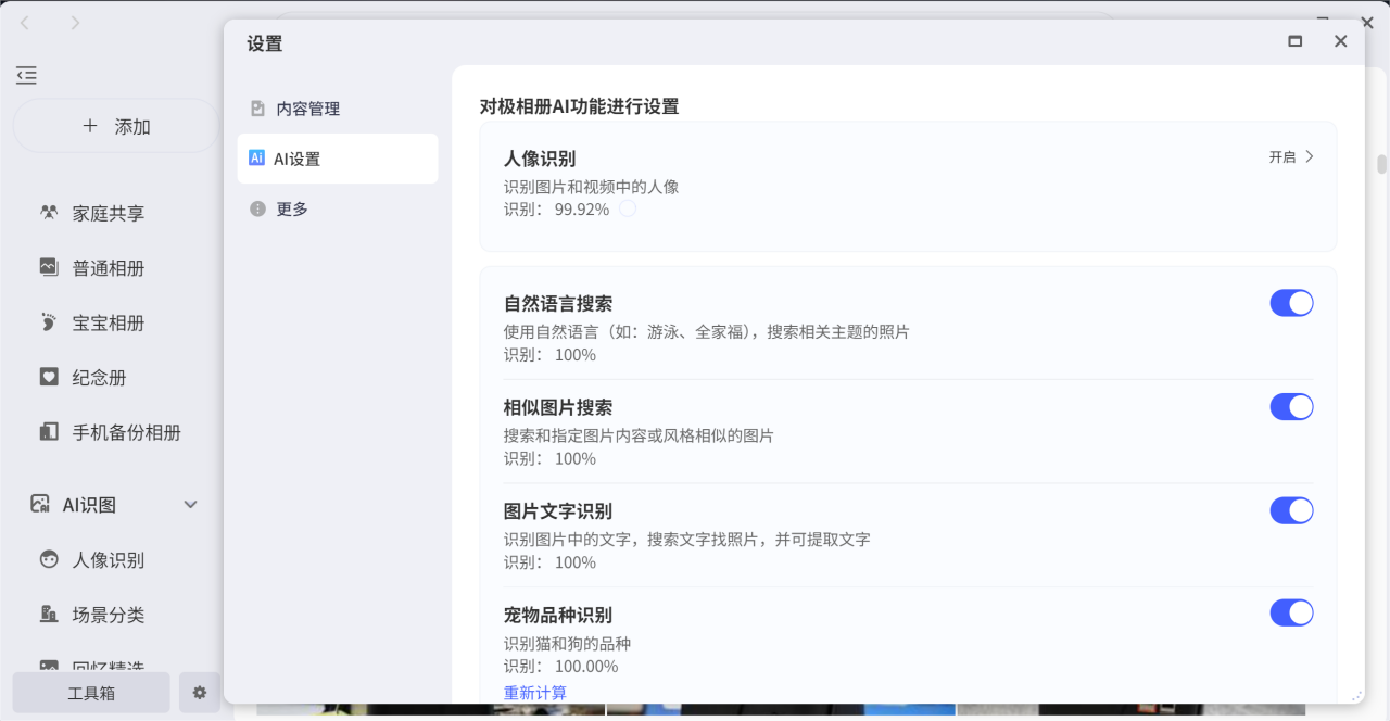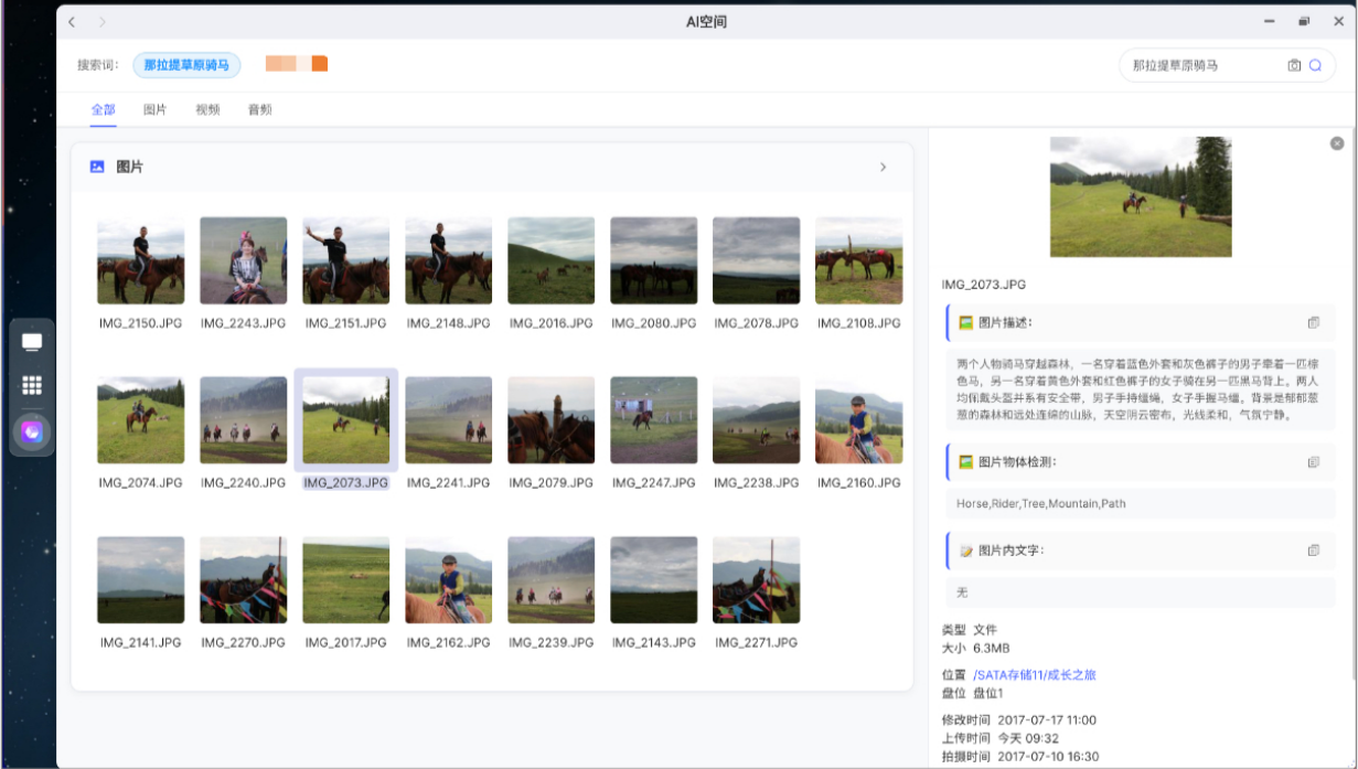 初始化完成后,AI模型会对图片、视频、音频文件进行深度学习,支持自然语言搜索、人像分组、内容标签化等功能——比如搜索“演唱会现场”“在户外玩耍的小朋友”,就能快速筛选出相关素材;对视频内容的识别更是细致到章节分段,自动生成时间轴式描述,大幅提升了海量数据的查找效率。