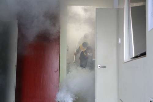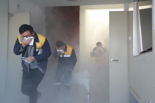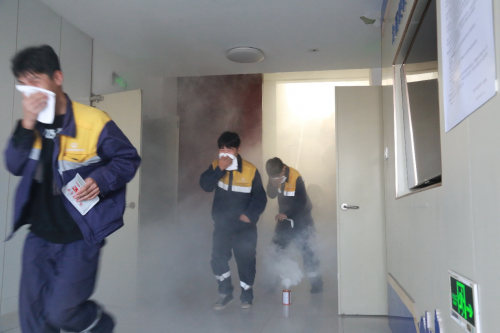 理论培训结束后,段部与济南西网电工区联合展开了一场模拟真实火灾的逃生演习。随着指挥口令下达,三个消防演习专用烟雾弹依次拉响,浓烟迅速在楼道内弥漫。参与演习的人员反应迅速、沉着应对,严格按照演习预案,用湿毛巾遮掩口鼻,低姿弓腰,沿指定疏散路线快速、有序地撤离至安全区域。整个演习过程组织严密、分工明确、行动高效,达到了预期效果。