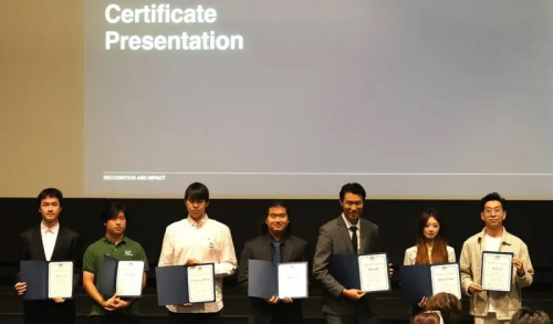 右起:美国领创商业联盟主席胡超、副主席金千旭及创意总监杲航现场领取加州众议院嘉奖证书