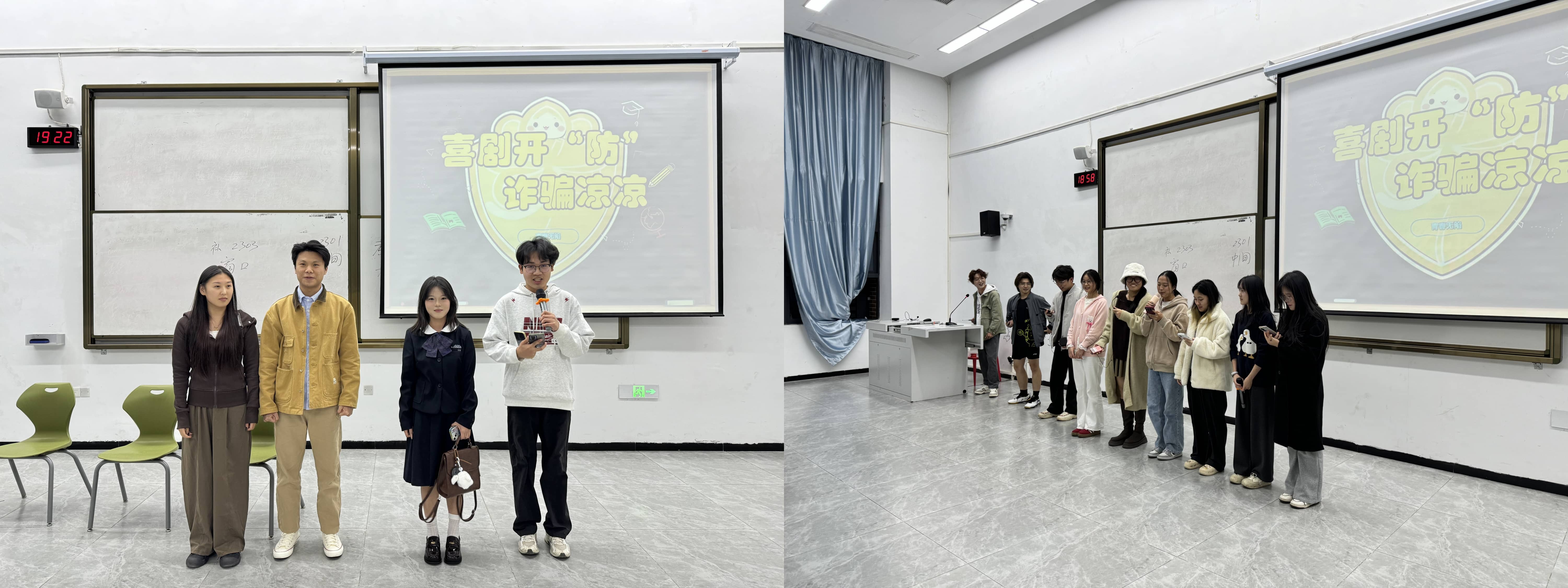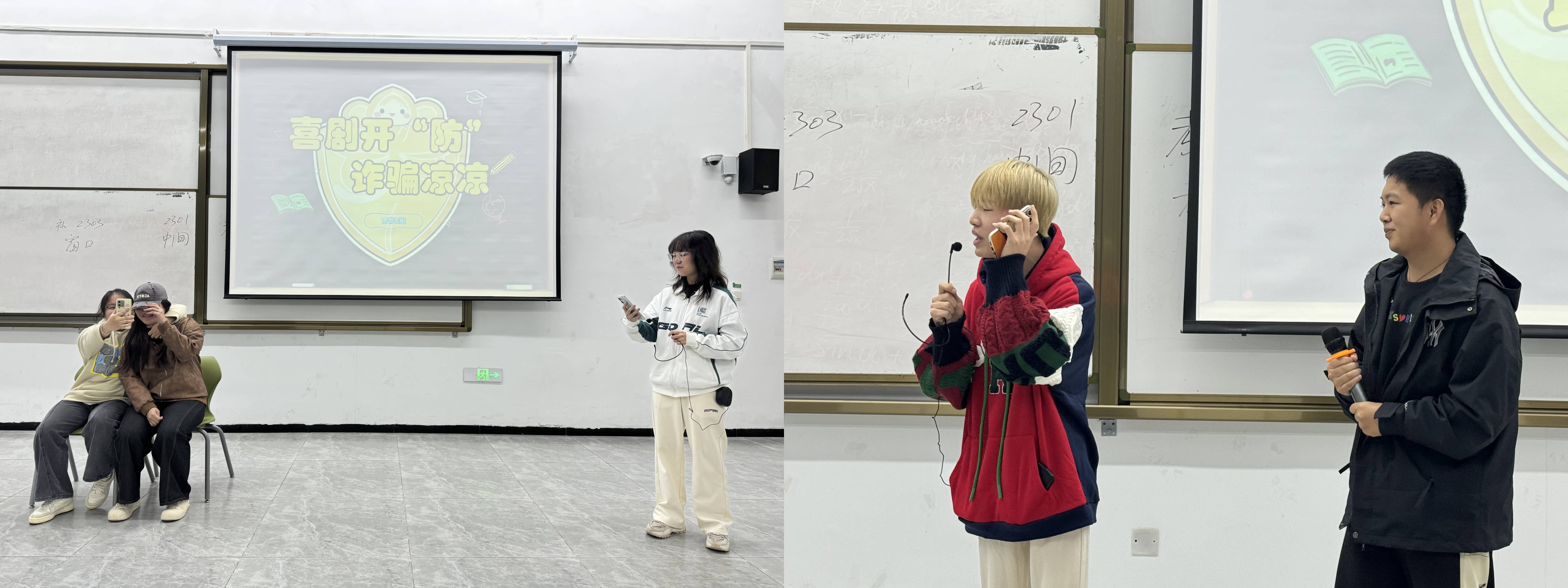 更具感染力的是学生自编自演的反诈作品:“三句半”《反诈顺口溜》用方言和押韵台词,将“陌生链接不点”“个人信息不泄” 等防骗要点编成记忆口诀;4 幕反诈情景剧则聚焦大学生易踩的“坑”—— 从“低门槛高回报”的刷单兼职,到 AI 技术冒充家人的“紧急求助”,再到瞄准升学需求的“考研内部题库” 陷阱,演员们生动演绎受害者从“心动”到“受骗崩溃”的全过程,让在场师生直呼“沉浸式警醒”。