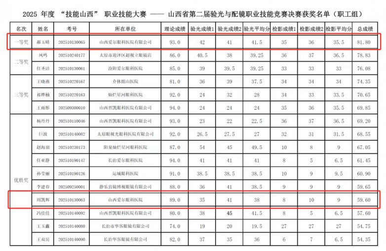 11月28日,山西省第二届验光与配镜职业技能竞赛决赛在山西卫生健康职业学院落下帷幕。山西爱尔眼科医院验光师郝玉晴凭借扎实的理论功底与精湛的实操能力,从众多参赛者中脱颖而出,荣获大赛一等奖,山西爱尔眼科医院验光师周凯辉荣获优胜奖。