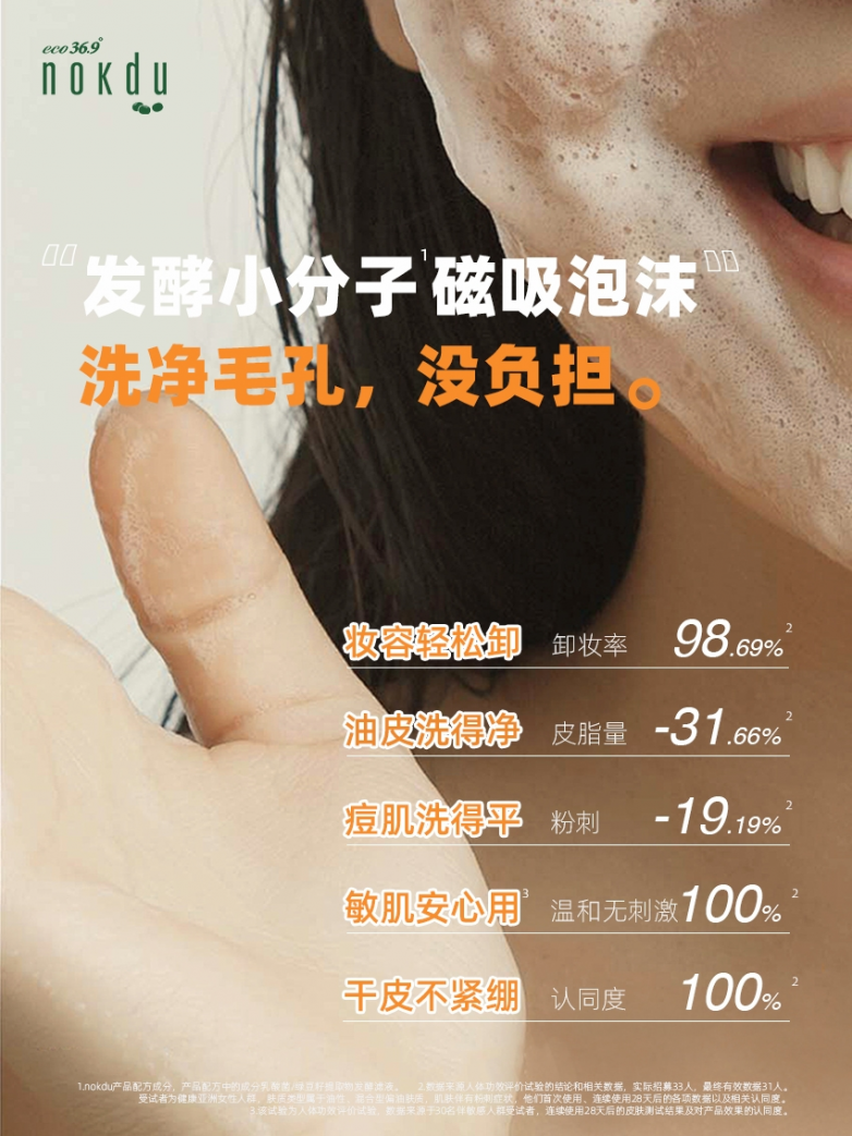 好不容易结束了忙碌的一天,卸妆却成了沉重的负担。担心卸不干净,又厌烦繁琐步骤。韩国nokdu绿豆洗面奶的绵密泡沫体系,为卸除日常淡妆带来了全新体验。报告数据显示,其卸妆率高达98.69%。使用时,取适量产品后揉搓,可以产生丰富绵密的“磁吸泡沫”,经过发酵处理的小分子泡沫质地细腻,轻轻按摩即可将日常淡妆、防晒等产品残留有效清除,让卸妆洁面一步到位,省时又省力。