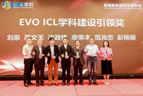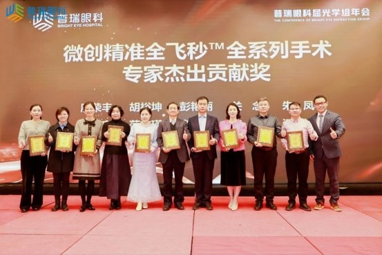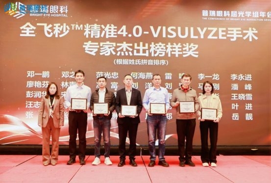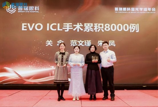 廖荣丰教授因在 EVO ICL 技术推广、屈光学科体系搭建及人才培养方面的突出成就,获 “普瑞集团屈光 EVO ICL 学科建设引领奖”;朱凤副院长凭借 EVO ICL 手术累积完成 8000 例的行业标杆级业绩,获集团专项表彰;二人还共同获评 “普瑞集团微创精准 全飞秒™全系列手术专家杰出贡献奖”,以肯定其在全飞秒技术临床应用、学术研究与区域推广中的引领作用;屈光手术专科副主任李永进与王彬医生则携手获得 “普瑞集团微创 全飞秒™精准 4.0-VISULYZE 手术专家杰出榜样奖”,彰显了合肥普瑞青年医生团队的成长潜力与技术实力。