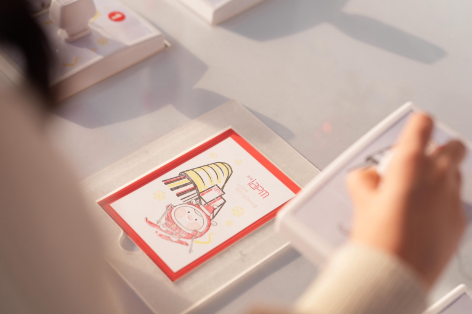 最后,沿着南昌路来到咚咚集章纪念站,可爱的Flying Dong Dong滑雪造型气模正等着你来合影留念,另外参与互动即可获得Flying Dong Dong的iapm限定版画套章明信片,用一张专属咚咚的冬日信笺,将心意与祝福传递,为这段场温暖浪漫的冬日童话假期划上句号。