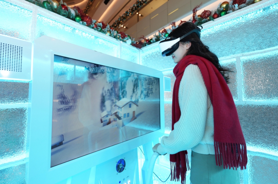 步入商场中庭,仿佛闯入一座“咚”日雪境,洁白的雪山在光影映衬下闪耀着梦幻光芒,Flying Dong Dong滑着雪板从山顶欢快跃下,圆润可爱的身影洋溢着冬日的喜悦。来跟随他们的身影,跳上陡峭的雪道,前往沉浸式滑雪体验区,在“雪场急速冒险”VR游戏中疾驰竞速,感受冰雪呼啸而过的真实快感。