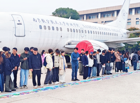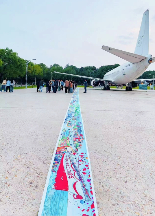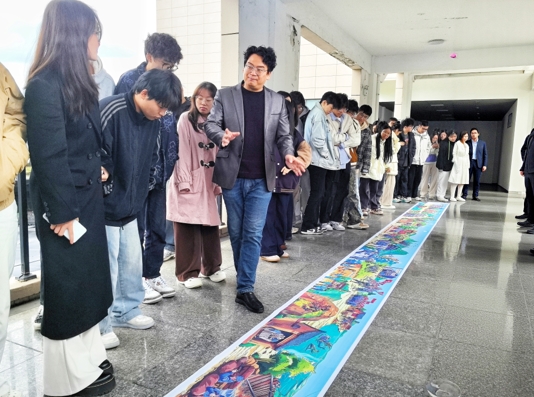 盛焰教授在南航金城学院飞机广场给学生讲解镜画长卷