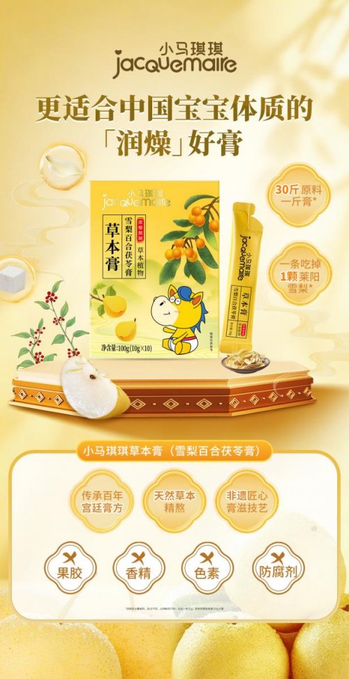 除了日常调理,选择一款安全、有效、适合宝宝体质的润燥产品同样关键。作为专注婴幼儿营养的法国百年品牌,小马琪琪基于中国宝宝体质研究,传承百年宫廷膏方,全新推出草本膏(雪梨百合茯苓膏),草本精熬,温和润燥,守护宝宝娇嫩肺腑。六味草本科学配比,严选莱阳雪梨、枇杷、百合、茯苓、鲜白茅根、苦杏仁六味地道食材,协同作用,精准应对“冬季燥”。恪守8道非遗膏滋*制作工艺,从选材到收膏,匠心贯穿始终。结合现代技术,确保每一滴膏体都纯净安全,营养尽数保留。甄选国家地理标志产品——山东莱阳雪梨。约30斤原料方能出一斤膏(因梨保水量差异,批次不同,比例略有不同),口口都是精华,让宝宝在冬日里轻松获得充沛的天然滋养。天然草本纯净配方,坚持不主动添加果胶、香精、色素、防腐剂。依靠食材本真的清甜滋味征服宝宝的味蕾,温和无刺激,安心滋养无负担,让妈妈放心选择。这个冬天,守护宝宝娇嫩肺腑,把“滋润”交给小马琪琪,把“舒心”还给全家。