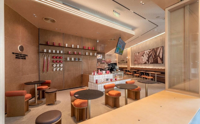 此外,Tims天好咖啡还在深圳打造了一家以“咖啡渣”为核心的“绿色环保试验店”,探索可持续零售新场景。店内大量采用“秸秆混合咖啡渣”制成的环保板材,从咖啡渣座椅、墙面装饰,到调味吧台与卡座,均以可感知的方式呈现“绿色循环”理念,将自然力量融入空间体验。