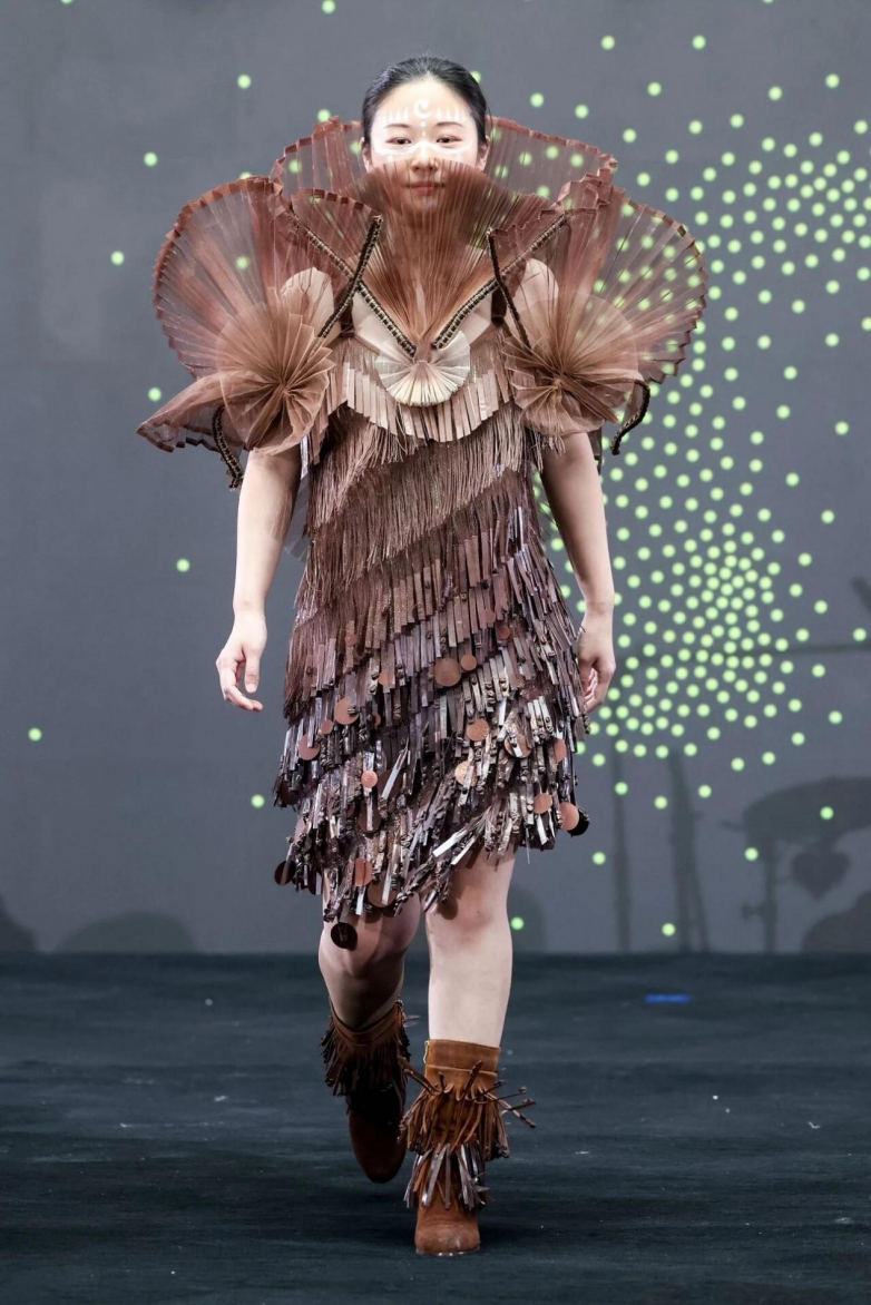 时装色彩整体倾向于咖啡的焦褐色,设计灵感源于舞者的舞裙,通过夸张的扇形结构与抽象几何形态,展现流动之美。配饰设计同样围绕吸管元素展开,涵盖头冠、胸针、项圈及手提包等,呈现环保与时尚的巧妙融合。