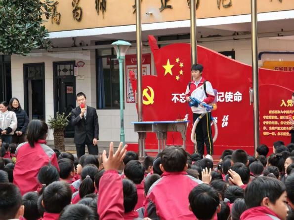 科技节在热烈的掌声中拉开帷幕。学校物理教研组教师率先登台,献上精彩纷呈的科学实验秀。伴随着一声低沉轰鸣,空气炮精准击发,将轻盈的乒乓球射出;紧接着,静电球迸发出炫目的紫色电弧,引得全场惊呼连连。老师们用严谨而不失幽默的演示,将抽象的物理规律化为可感可知的奇妙现象,生动诠释了“严实精导”的教风——治学严谨、业务精湛、善于引导,更以“微笑、激情、自信”的三张名片点燃了孩子们心中的科学火种。
