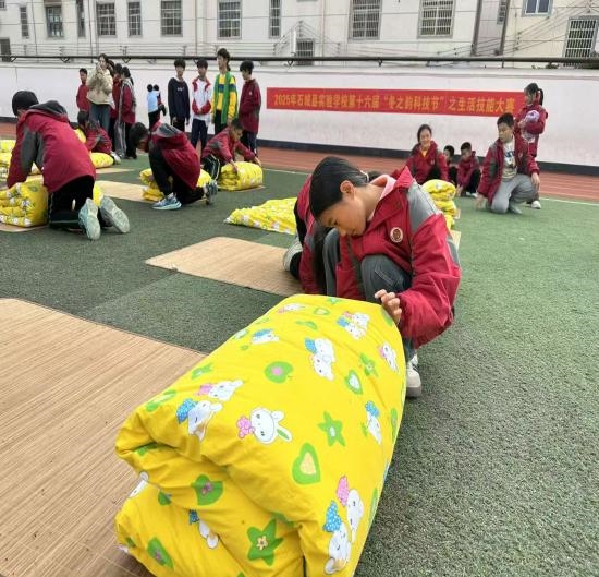 活动现场,学子们化身“生活小能手”与“科创小达人”,在不同赛场各展所长。生活技能大赛的叠被子项目区域,俨然是自理能力的“练兵场”。随着哨声响起,参赛学生迅速上手,捋平被角、压实被面、折叠塑形,一气呵成。原本松散的被子,转眼变成棱角分明、方正平整的“豆腐块”。他们的动作利落娴熟,不仅展现出扎实的生活自理本领, 更诠释了“热爱劳动、自立自强”的优良品质,让务实肯干的精神在赛场闪光。