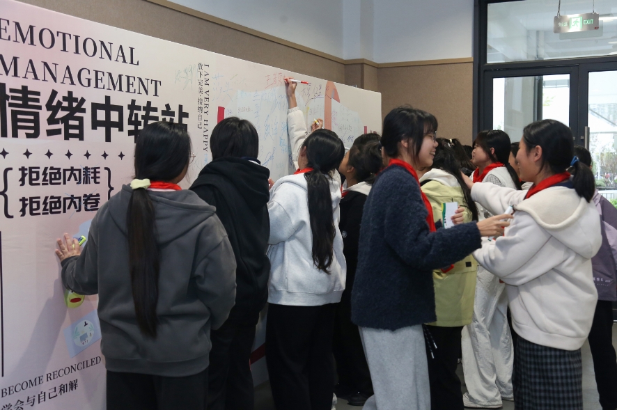 活动聚焦压力管理、沟通表达与情绪管理三大主题,助力青少年健康成长。在泗港实验学校,开展了"成长不怕难"主题课程,通过抗挫训练营与拼图体验引导学生释放压力;在第七中学,开展了"沟通的桥梁"主题课程,设置情绪脸谱DIY、团队传声游戏,助力青少年提升表达协作能力;在第八中学,以"解锁你的小情绪"为题的课程,引导参与者通过情绪小屋涂鸦与减压运动,在轻松氛围中探索心灵成长,掌握心理调适技能。