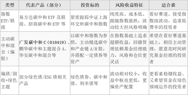 从投资方式和风险收益特征来看,A股市场的碳中和基金大致可以分成三类:
