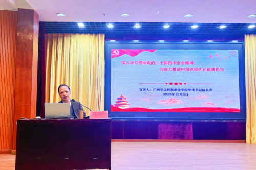 2025年12月2日下午,东一报告厅内座无虚席,广州华立科技职业学院党委书记陈良声为计算机信息工程学院300余名师生作党的二十届四中全会精神专题宣讲报告。报告以“深入学习贯彻党的二十届四中全会精神,为奋力推进中国式现代化挺膺担当”为主题,推动全会精神直达青年心坎。