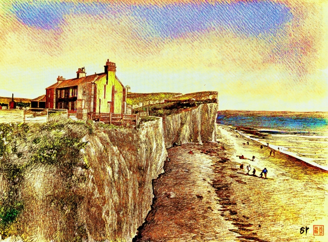画面中,海岸峭壁的肌理、光影交织的天空、沙滩上的生活气息被细腻勾勒,既有钢笔线条的精准质感,又有水彩晕染的灵动意境,展现出创作者独特的艺术视角与扎实的创作功底。也彰显了当代钢笔水彩创作领域的新高度。