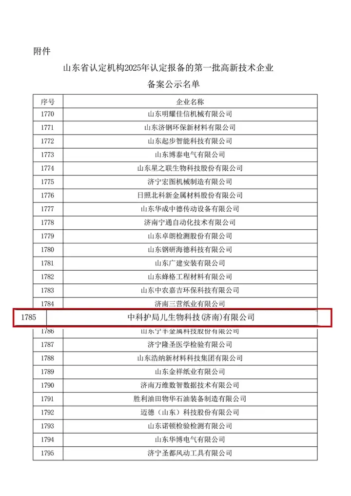 近日 中科护局儿生物科技集团迎来重要发展里程碑 凭借在生物科技领域的突出创新能力、扎实核心技术实力与强劲综合发展潜力 成功入选并正式获评山东省高新技术企业,获得省级权威部门的充分肯定。