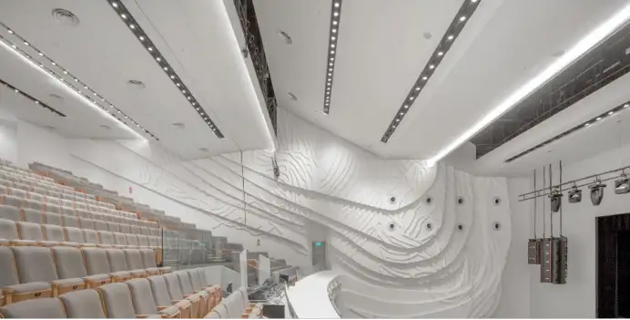 在新加坡盖特威剧院的应用中,通过算法生成波浪形吸音体,既优化了声场扩散,又创造出流动的艺术视觉效果。